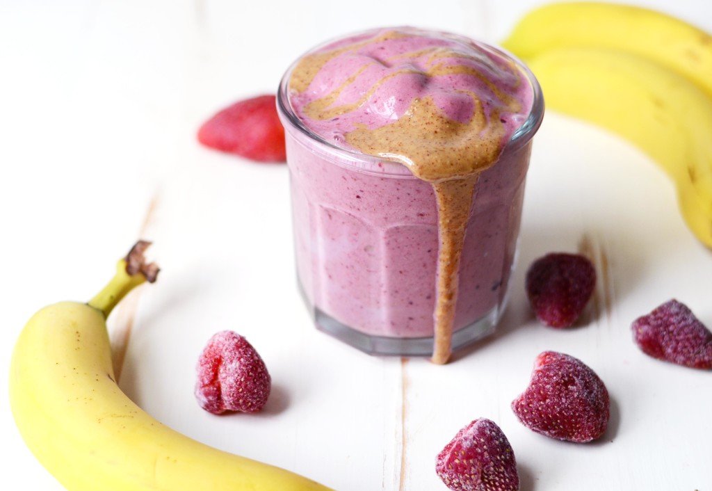 Almond butter, strawberries and bananas blend beautifully into a smoothie that tastes like an all-American classic.