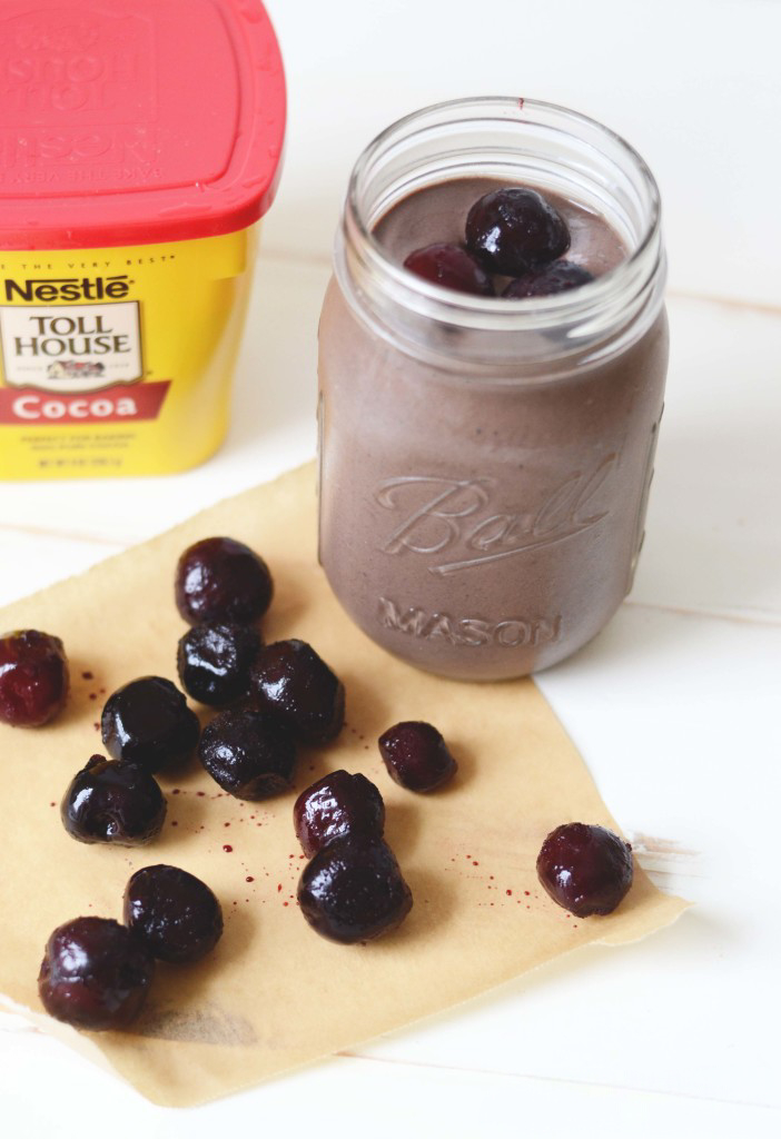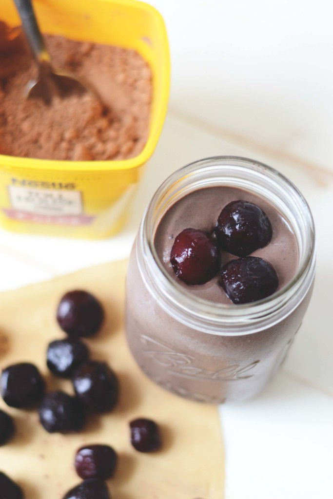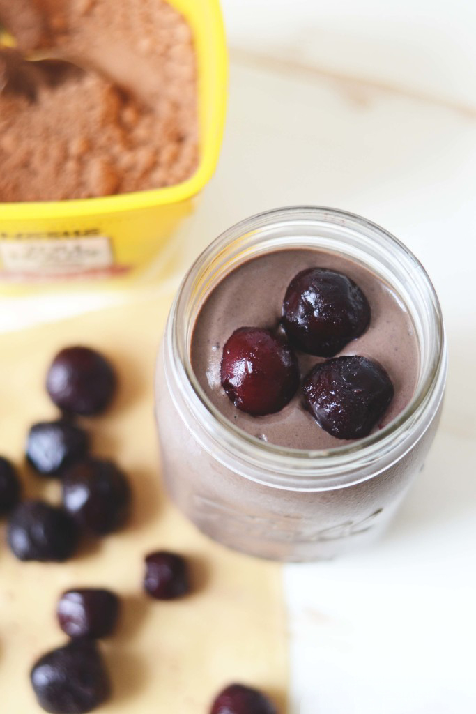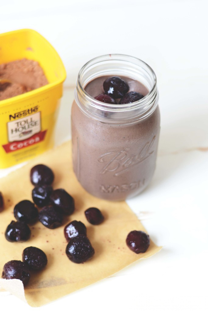 Cherries had found their perfect match. An elegant solution to my smoothie equation. Juicy, plump, frozen cherries meet deceptively healthy, but indulgent tasting chocolate and tah dah – a match blended in heaven. Looking to make this smoothie even more kick-ass? Grab a handful of spinach and toss it in. I promise you won’t even taste it, and trust me you’ll feel like a boss when you’ve already had spinach and it’s only 10 AM. You’ll also feel like a mega boss because you’ve already had chocolate and it’s only 10 AM.