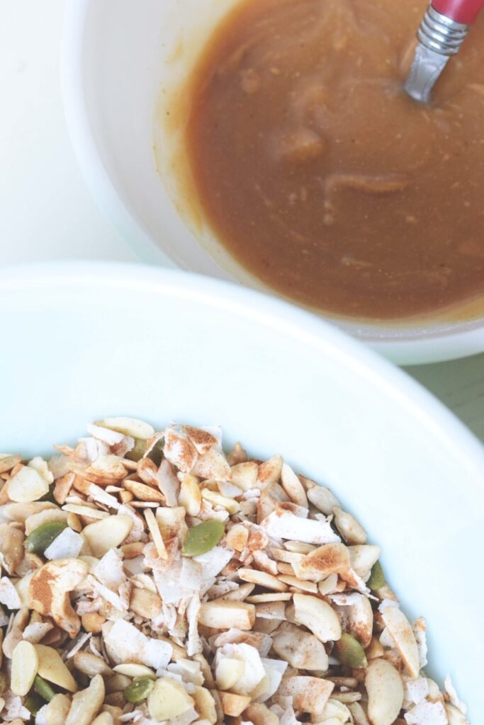 - Melt ¼ of coconut oil (30 seconds in the microwave in a microwave safe container) and pour into small bowl and add ¼ cup of maple syrup and ¼ of cashew butter stir until well combined