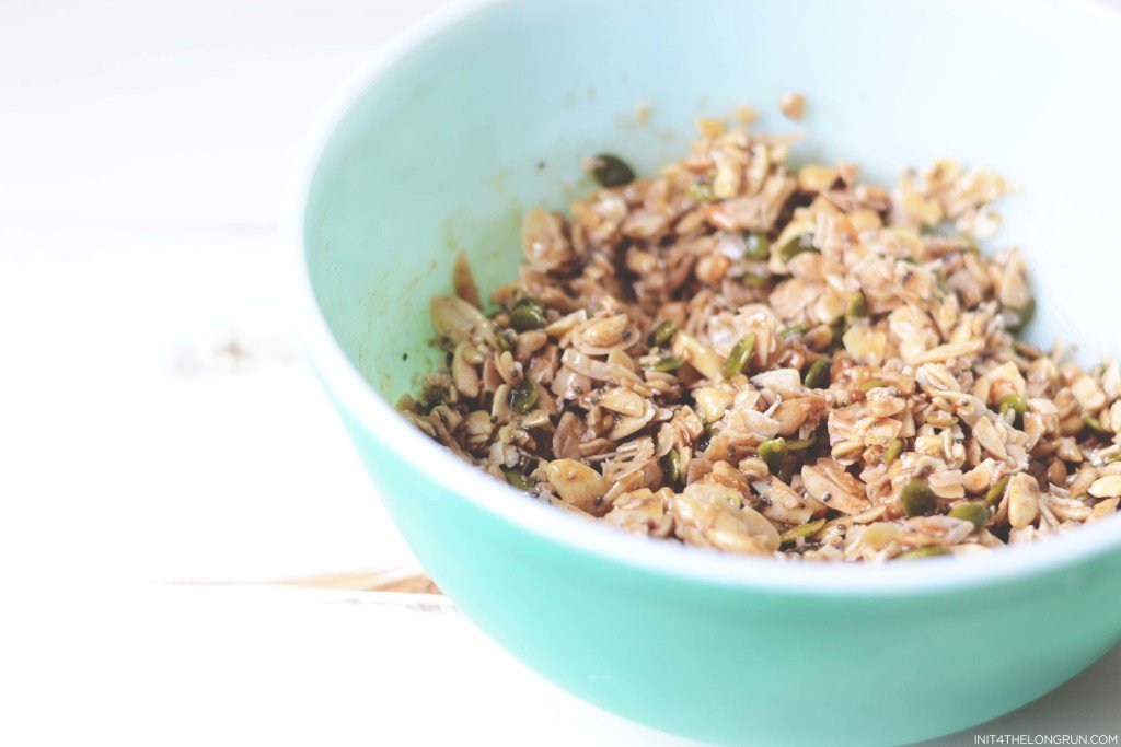 - Spread granola out onto a greased baking tray and bake in oven for 20 minutes stopping to stir after 10