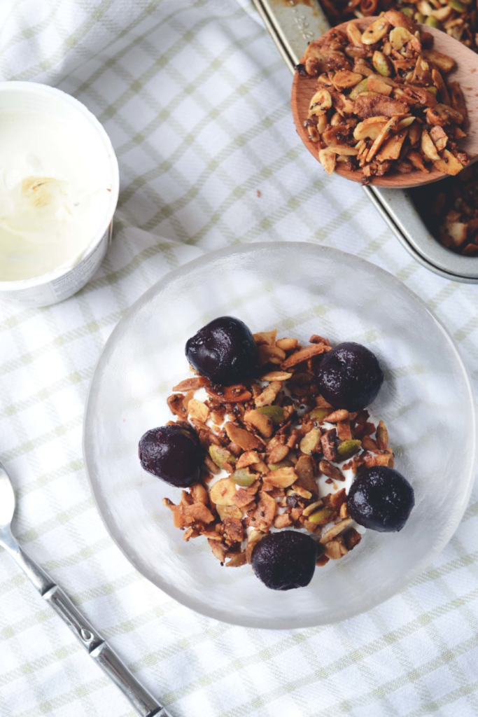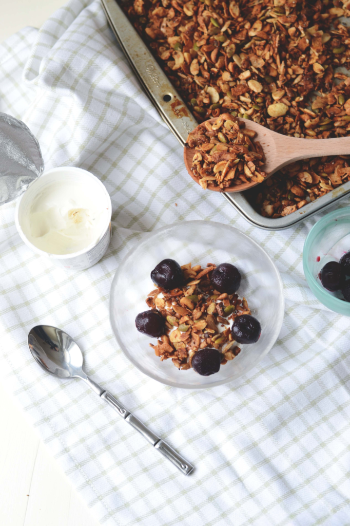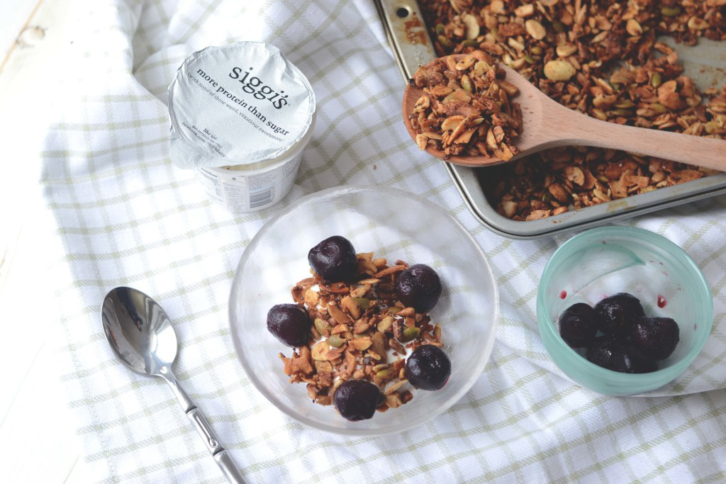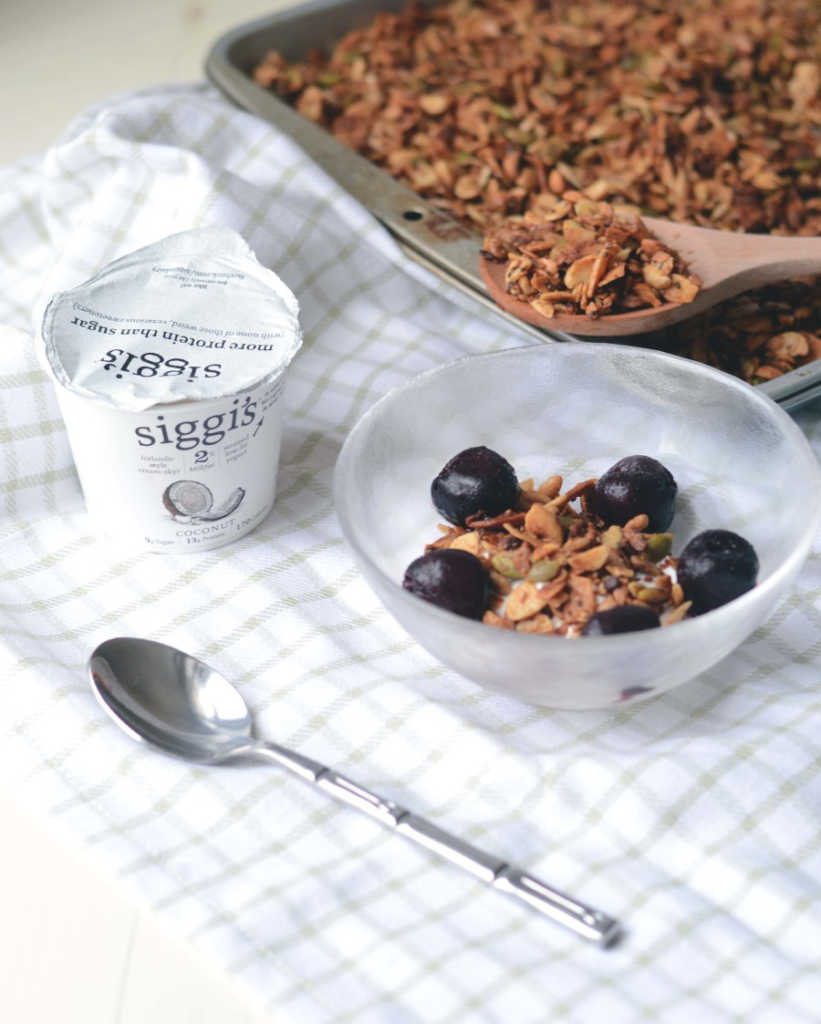 What better recipe to pair with a healthier yogurt, than this grain-free granola? I’m so excited to share this recipe today because it’s been rocking my world. I’ve given little sample baggies to a bunch of my friends and family because I couldn’t contain how proud I was of this granola recipe. When I first tried it I couldn’t believe how perfectly crunchy and maple-y and slightly nutty it was. Seriously I cannot get enough. Sprinkled on top of a cup of Siggi’s? Heaven.