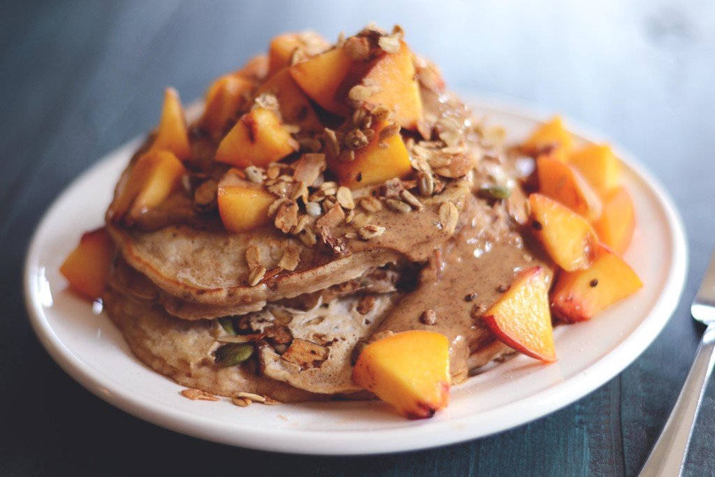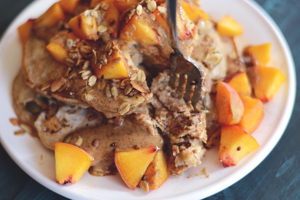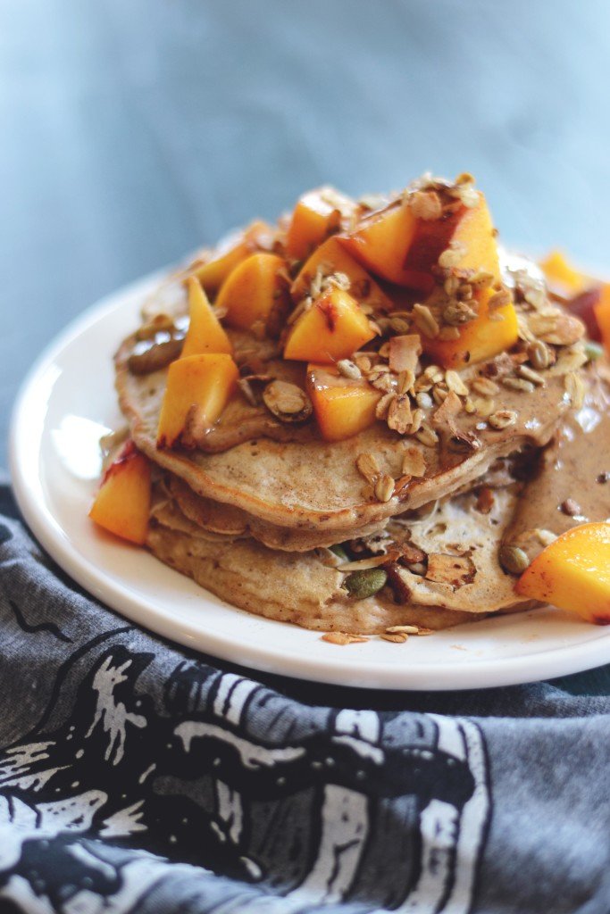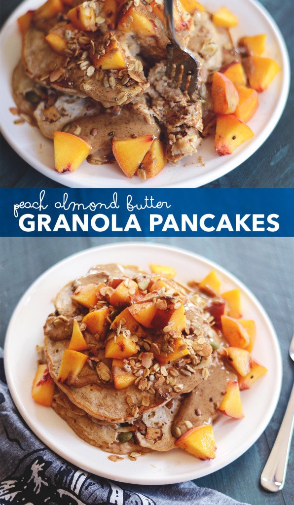 I think we can all agree that you physically can’t be upset when you’re eating a good stack of pancakes. It’s like how you naturally smile when you say “cheese,” it’s just a fact. So, I’m not trying to brag, but I’m pretty much sharing a recipe for happiness… #nobigdeal. These light, fluffy bites are filled with crisp granola and finished with fresh peach slices. Bonus: if you’re feelin’ extra jazzy (like I was) you can drizzle some almond butter on top. Yeah, this flavor/texture trifecta is never to be messed with.