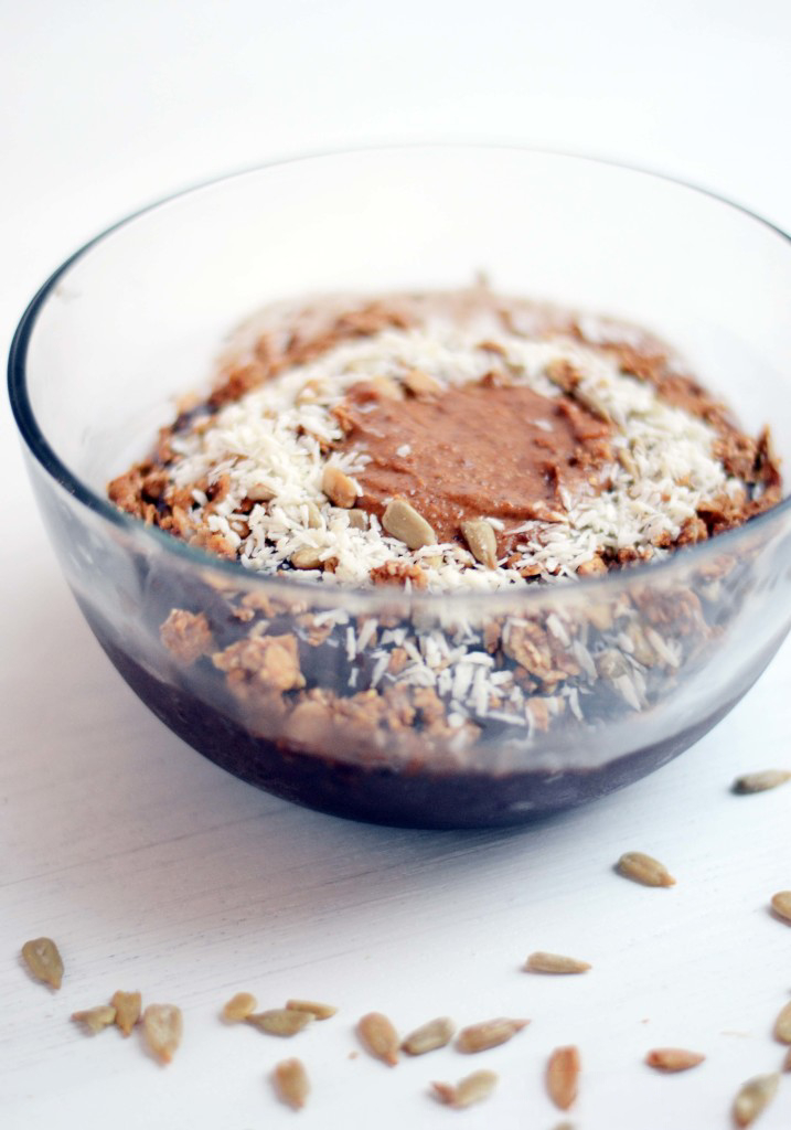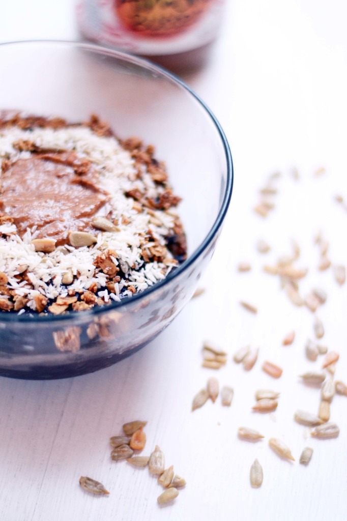 One of my favorite parts of the smoothie bowl is adding toppings. I’m not a pro at making my smoothie bowls insta-gorgeous (yet) but I’ll get there some day. I love adding granola, seeds, coconut and as a special treat sometimes I’ll add almond butter. MMmm. I try not to go over board, but they key word is try.