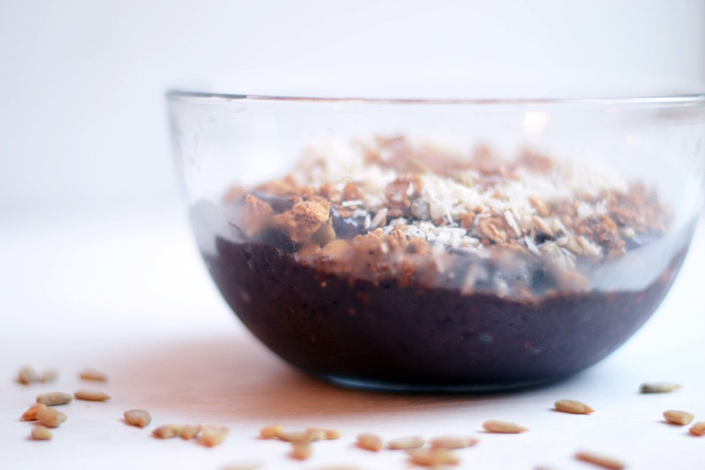 Frozen Açai + Frozen Banana + Favorite Fruit/Veg + Almond Milk (or Coconut Water) + Toppings (here’s where you can really get creative and have fun!)