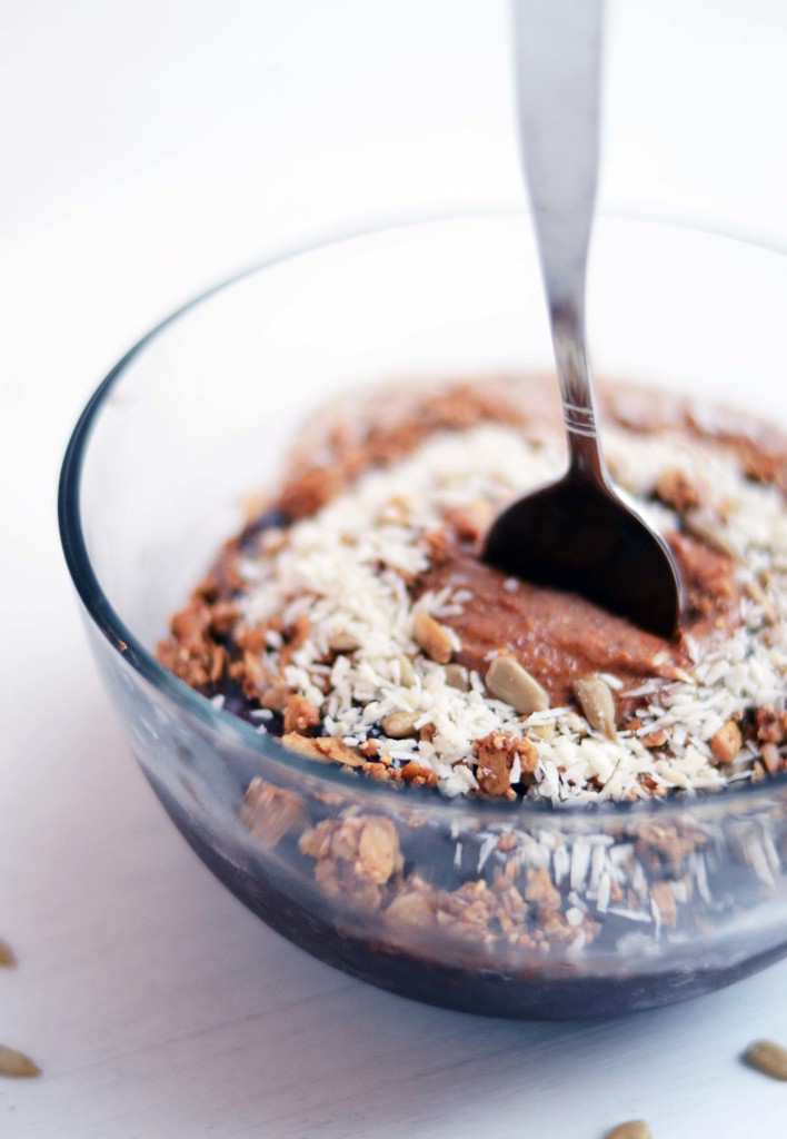 One thing you have to watch, as with most smoothies, is that you don’t accidently overload it with too much sugar from fruit. I know I’m guitly of this sometimes, which is why I always try to add some kind of leafy green in as well, usually spinach because it doesn’t affect the taste of the smoothie. As for toppings I love my Purely Elizabeth granola which only has 6g of sugar per serving. It’s definitely the best store bought granola out there, and no I’m not being paid to say this.
