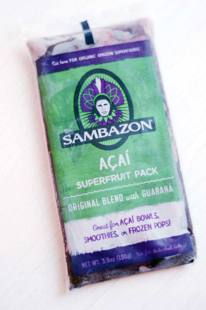 I’ll back up, for folks who aren’t familiar with an Açai (ah-sah-ee) Bowl it’s a thick smoothie made with açai pulp (often frozen). Açai berries are found in the amazon on açai palms. They’re packed with antioxidants, amino acids and essential fatty acids. They’re dark purple in color and the resulting smoothie bowls are usually a beautiful dark purple. You can find açai smoothie packs at places like Whole Foods and Wegmans in the frozen fruit section. I’ve also seen açai powders but I’ve never tried them before. I like the taste and texture of the smoothie packs.