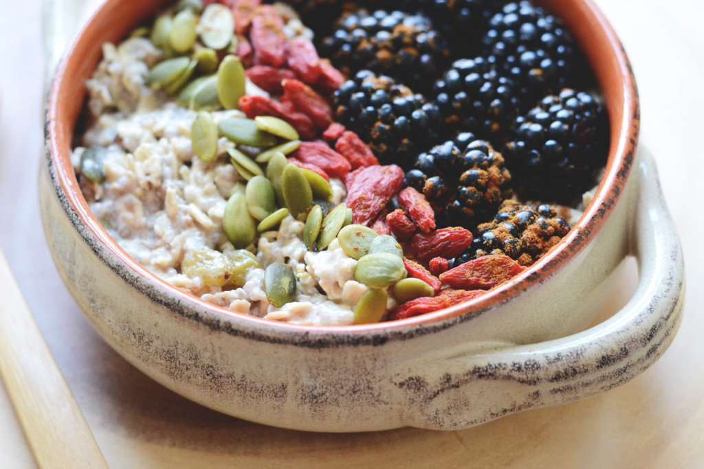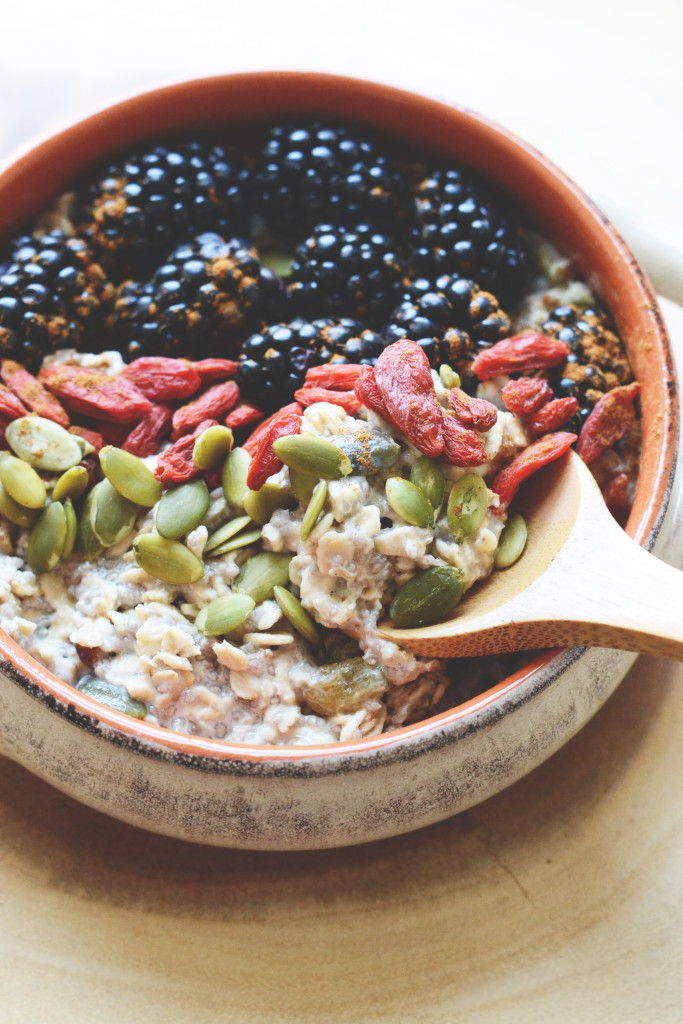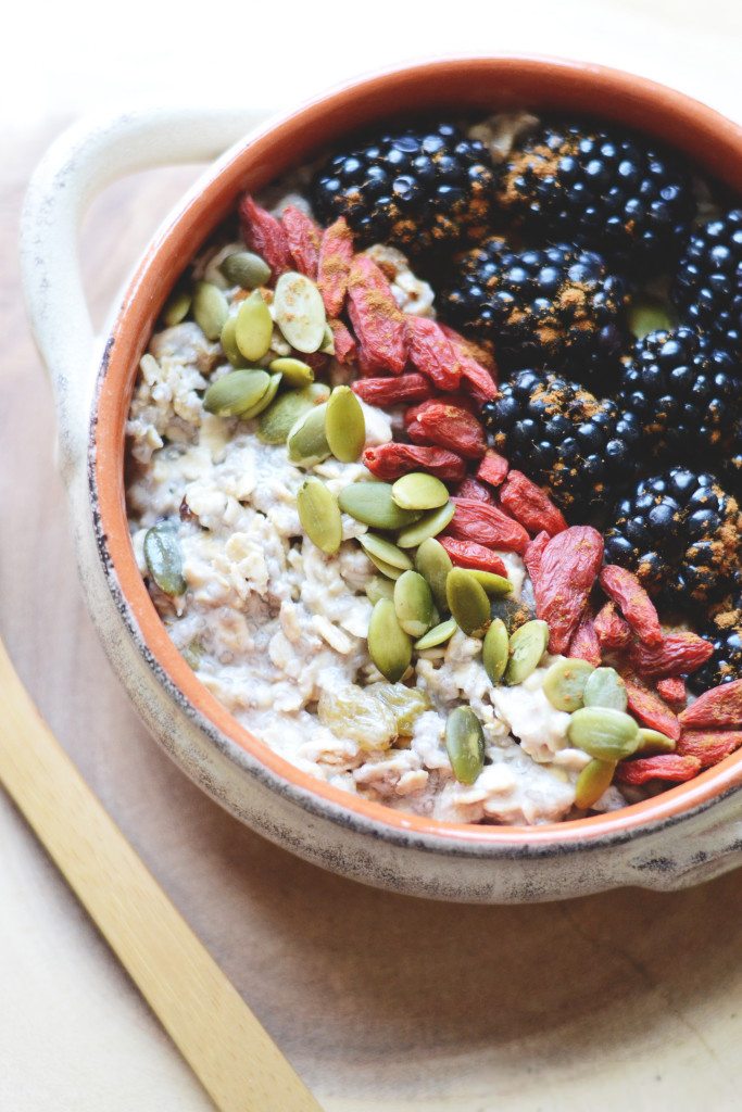 3. To serve pour oats into a bowl and top with blackberries, goji berries and pepitas